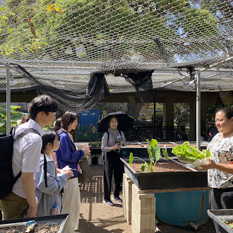 今年も、広島女学院大学より管理栄養学科の土谷先生と4名の学生がハワイへ研修にお越しになりました。今回は、ワイキキにあるホノルル動物園に隣接するジェファーソン小学校で学校給食体験をしました。この学校には各学年の花壇があり、ネギやミニトマトを育てています。また、専門にケアをするスタッフの指導の元で、アクアポニックス(タラピアの養殖と水耕栽培のシステム)やハイドロポニックス(水耕栽培)でマノアレタスやタロ芋も育てています。